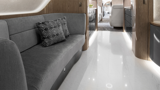 Lineage 1000E, eines der größten Geschäftsreiseflugzeuge, mit Echtsteinboden.