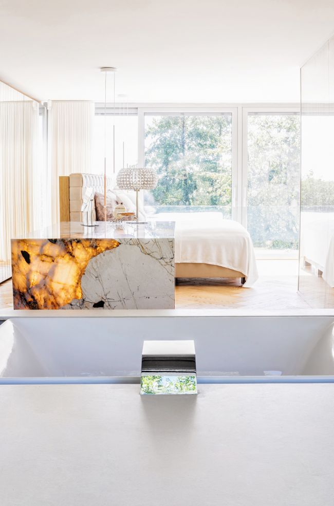 Die LIXOS® Natursteinfurniere sind so dünn, dass sogar Licht durch sie hindurchfällt. Die Farben, Strukturen und Maserungen des Steins erstrahlen im Licht in noch nie da gewesener Intensität. So entstehen durch die Kombination aus LIXOS® Natursteinfurnieren und Glas, insbesondere in der Architektur, beeindruckende Möglichkeiten. Die Textur des Materials wird durchleuchtet und die Geschichte und Entstehung des Steins wird Teil des Lebensraums. Neben der natürlichen Durchleuchtung durch das Sonnenlicht auf großflächigen, transluzenten Glas-Stein-Fassade, ist auch künstliche Durchleuchtung im Innenraum großflächig realisierbar.
